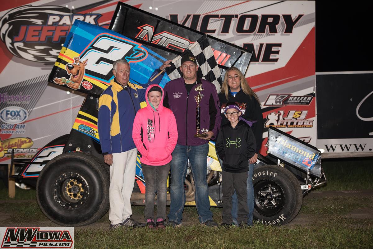 The Nebraska 360 vs Midwest Sprint Touring Series made their final call on the Park Jefferson black gumbo, and the results saw Greg Bakker slip into victory lane from outside row 1. Bakker, who looked to finish in the runner up spot, dug down deep and roared off the bottom of turn 4 to slip under Knoxville season champion Clint Garner to get the win. Visiting Australian Scott Bogucki was 3rd.