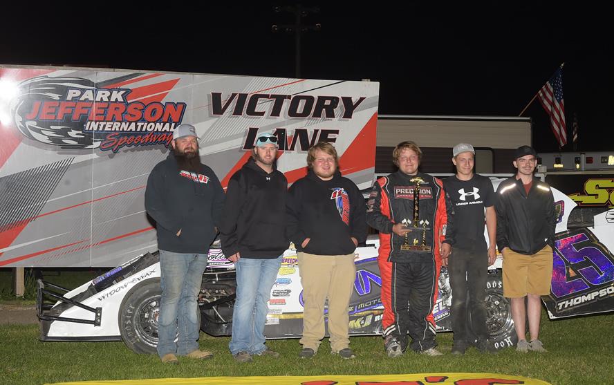Cody Thompson went on a tear last season at Park Jefferson and got himself back into victory lane in a hard-fought victory. Thompson came from the fourth row to get by a number of tough runners for the win. James Roebuck proved he could quickly master the Park Jefferson surface as he roared out to an early lead after battling with James Richert. A mid race caution was all Thompson needed as he ran his patented outside/in move off turn 2 to take the top spot which he would not relinquish. Roebuck was second and Brian Osantowski was third.