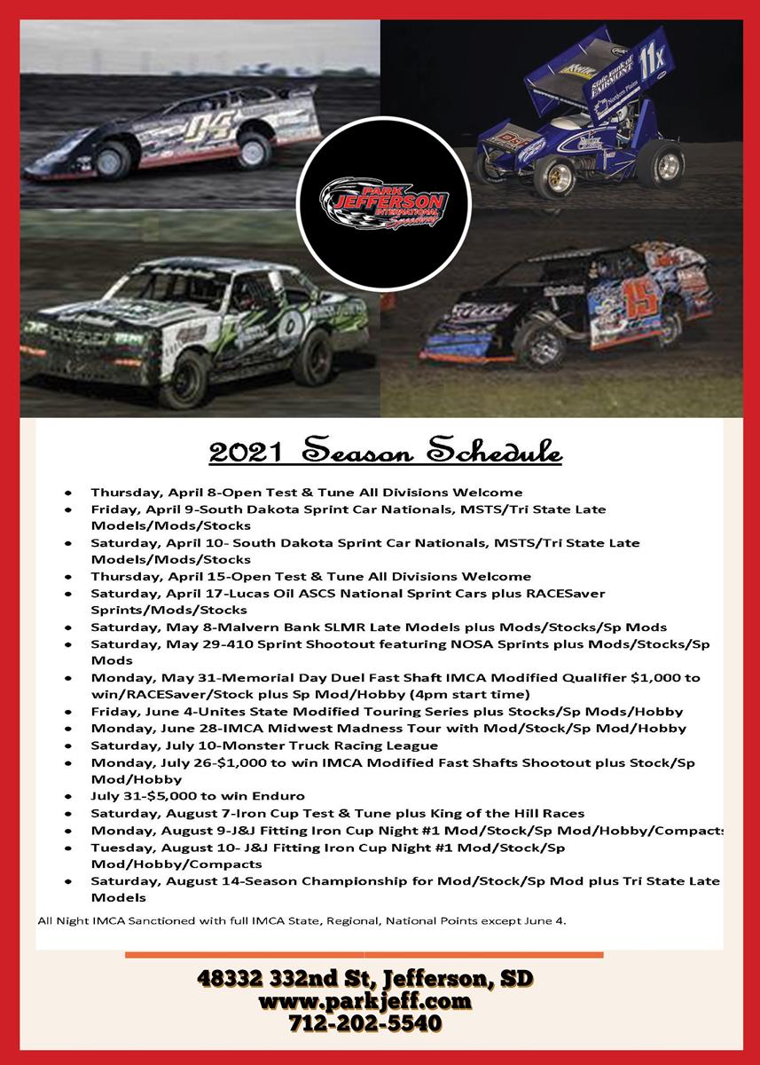 Kicking off the season is the 2 day double header featuring the MSTS Sprint Cars who will present the South Dakota Sprint Car Nationals along with the Tri State Late Models and Night 1 of the IMCA sanctioned modifieds and stock cars. The sprint cars return the following Saturday as the Lucas Oil ASCS Series hits Park Jefferson Speedway along with the RACESaver Sprint Cars. It will be the ASCS first appearance at Park Jefferson since 2016. As the calendar turns to May, the Malvern Bank SLMR Late Models make their annual stop. Memorial Weekend sees a first as the 410 outlaw sprints return as the Northern Outlaw Sprint Association makes its first ever stop at Park Jefferson on Saturday night for 6th annual Memorial Duels which will also pay $1,000 to win the IMCA Modifieds. Monday will see a late afternoon memorial special with the RACESaver Sprints gunning for $1,000 to win. June sees the biggest USMTS race in South Dakota history as the national touring drivers will be gunning for $10,000 at the South Dakota oval. After a June break, the IMCA Midwest Madness Tour will bring night 3 to Park Jefferson on Monday, June 28. The Monster Truck Racing League brings some big-time horsepower to Park Jefferson on July 10th. A Monday night IMCA Modified Special will take center stage on Monday, July 26th after the Silver Dollar Nationals. That Saturday will see the first ever Sioux City Enduro. The pinnacle of the Park Jefferson local racing season will see a shift to Monday and Tuesday nights as the 8th annual J&J Fitting Iron Cup will bring the best IMCA drivers to challenge Siouxlands best for the coveted Iron Cups. The season will wrap up Saturday, August 14th with Season Championship night for the IMCA Modifieds, Stock Cars and Sport Modifieds along with the Tri State Late Models. The complete schedule can be found at http://www.parkjeff.com/schedule.
