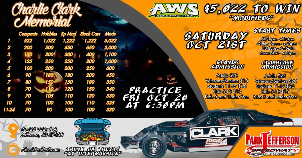 In memory of the legendary Charlie Clark, Park Jefferson presents the Charlie Clark Memorial race, with a hefty $5022 on the line for the winning Modified driver.