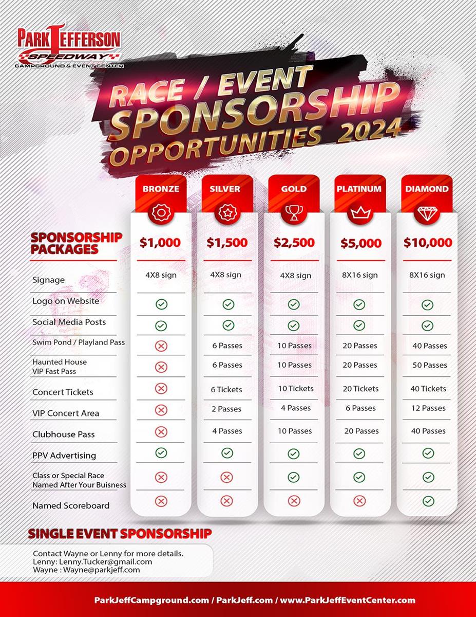 We're thrilled to announce exciting sponsorship opportunities for the upcoming 2024 race season. Whether you're a local business eager to reach a wide audience or an individual passionate about supporting our beloved race track, we have tailored packages to suit your needs.