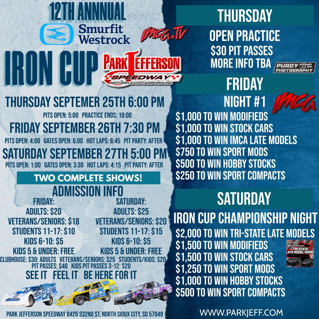 The weekend we've all been waiting for... Iron Cup Weekend at Park Jefferson Speedway!! And this year's 12th Annual Smurfit WestRock Iron Cup looks to be the biggest and best yet, featuring TWO complete shows Friday September 26th and Saturday September 27th! Practice will also be held on Thursday September 25th starting at 6:00 PM.